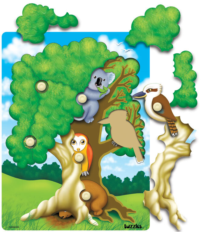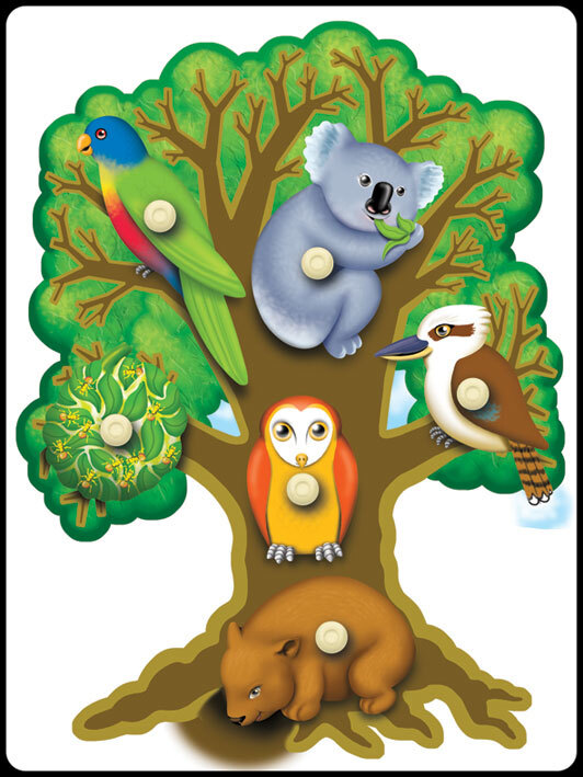 Animals peek from under the tree, find the wombat, the Rainbow Lorikeet, the Owl, Koala and Kookaburra. This 2-layer peg puzzle is part of our early discovery series. Children learn to discover a world outside their own, expanding their horizons and teaching them the importance of their environment. At the same time they learn the skills they need to read and write.