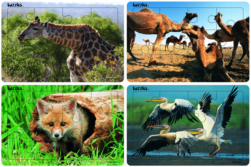 A set of 4 Flat Tray wooden Photographic puzzles show images of Camels, Pelicans, a Fox hiding in a Log and Giraffes. It is called Wild Animals Set 1.