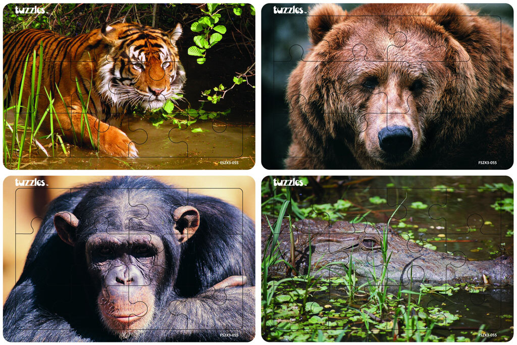 Get up close and personal with some of the most ferocious wild animals in the world. Sharp photography and vibrant printing technology make these photo puzzles come alive. Set of 4 puzzles in traditional cut. A set of 4 Flat Tray wooden Photographic puzzles featuring a Tiger, A Monkey, a Bear and a Crocodile.