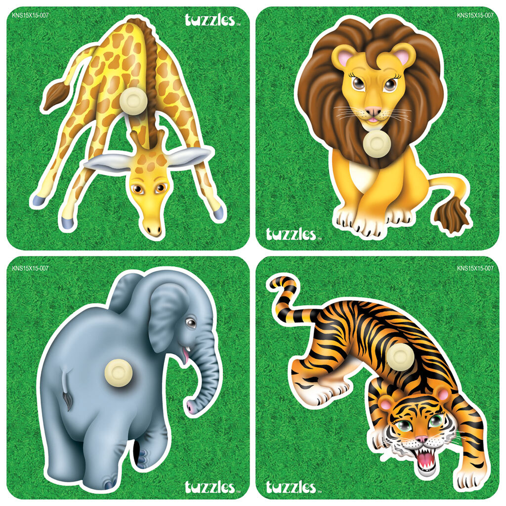 Set of 4 single piece peg puzzles featuring a Lion, a Giraffe, an Elephant and a Tiger. Four seperate puzzles allow more than one child to take part in the activity and this encourages interactive play and language development.